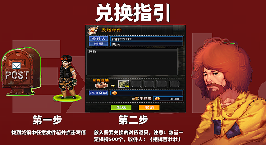 前往城镇中任意位置点击信箱→写信→ 收件人填写:(指挥官壮壮) →放入500个对应物品 →发送。